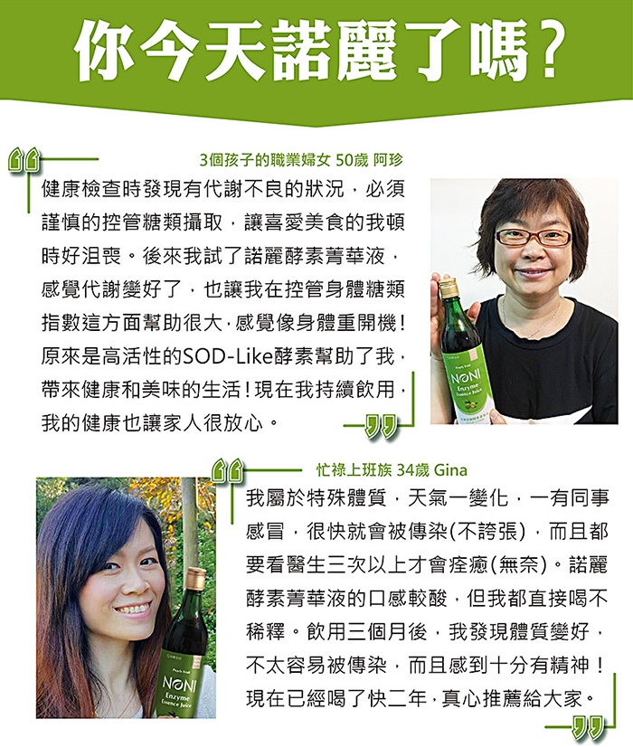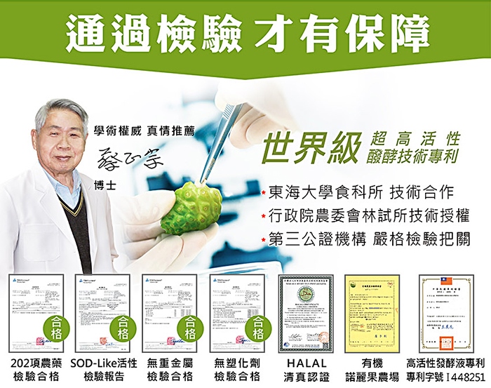| 【品 名】《珍果》諾麗酵素菁華液 【容 量】 600 ml / 瓶,共12瓶 【主 成 分】100% 諾麗果漿 (醱酵果汁) 【包 裝】外盒+深色玻璃瓶裝 【飲用方法】 每天早餐前1次,每次20ml。 或可改為每天2次,早晚餐前各10ml。 可依個人體重、反應、體質狀況,適量增減。 放置冰箱內冷藏,口感更佳。 可用5倍溫水或其他果汁稀釋、亦可直接飲用。 先在舌下靜置約5秒,再慢慢滑下喉嚨。 【注意事項】服藥期間、孕婦、特殊體質、腎臟病者,請先洽詢醫師 本產品為天然水果,內含天然果膠與水果纖維成分,若有沉澱或顏色變化, 係屬自然現象。且口感風味隨採收季節會略為改變,請安心飲用。 【保存方式】請置於陰涼處,無添加防腐劑,開封後請冷藏,並於兩個月內飲用完畢。 【保存期限】三年 【產品投保】本產品已投保產品責任險新台幣5000萬元 |