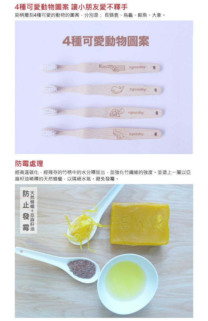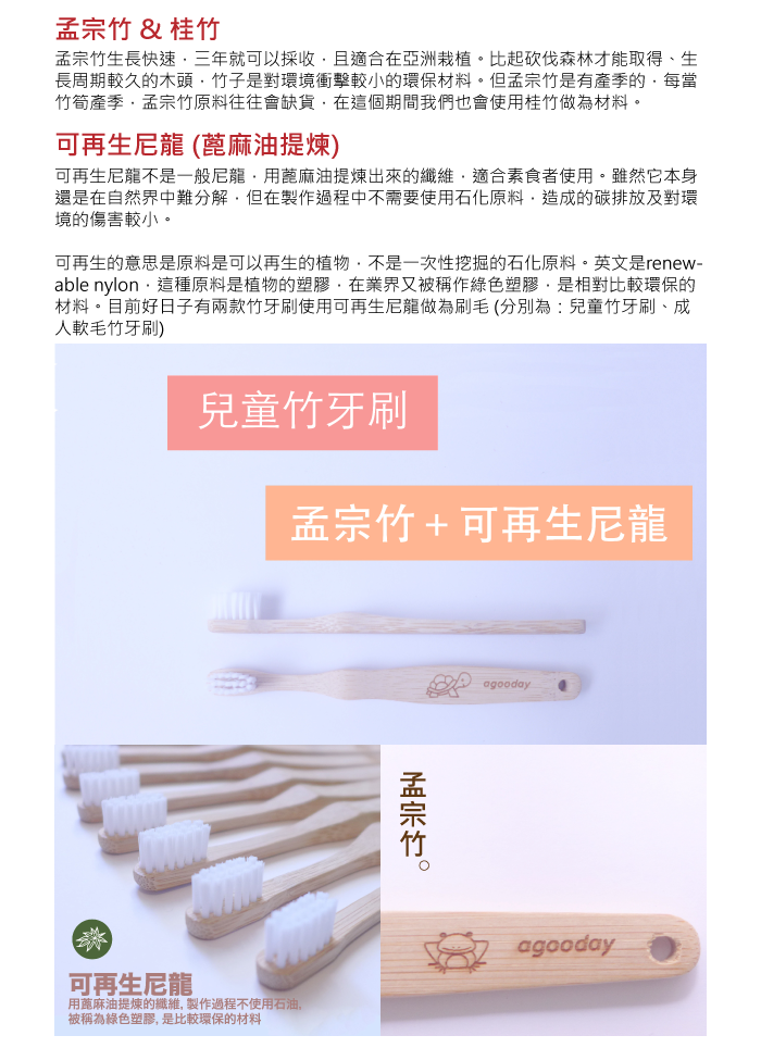 | 【品名】好日子環保兒童竹牙刷 【材質】刷柄-孟宗竹、刷毛-可再生尼龍 【規格】全長14公分,刷頭2公分 【包裝】4入,每支牙刷皆有外盒,每4支再附一紙盒 【產地】台灣設計,中國製造,台灣團隊嚴格把關 【保存期限】五年(未開封),開封後建議1~2個月更換牙刷 【注意事項】請依照正確刷牙方式,刷完牙後請保持刷毛乾燥 |