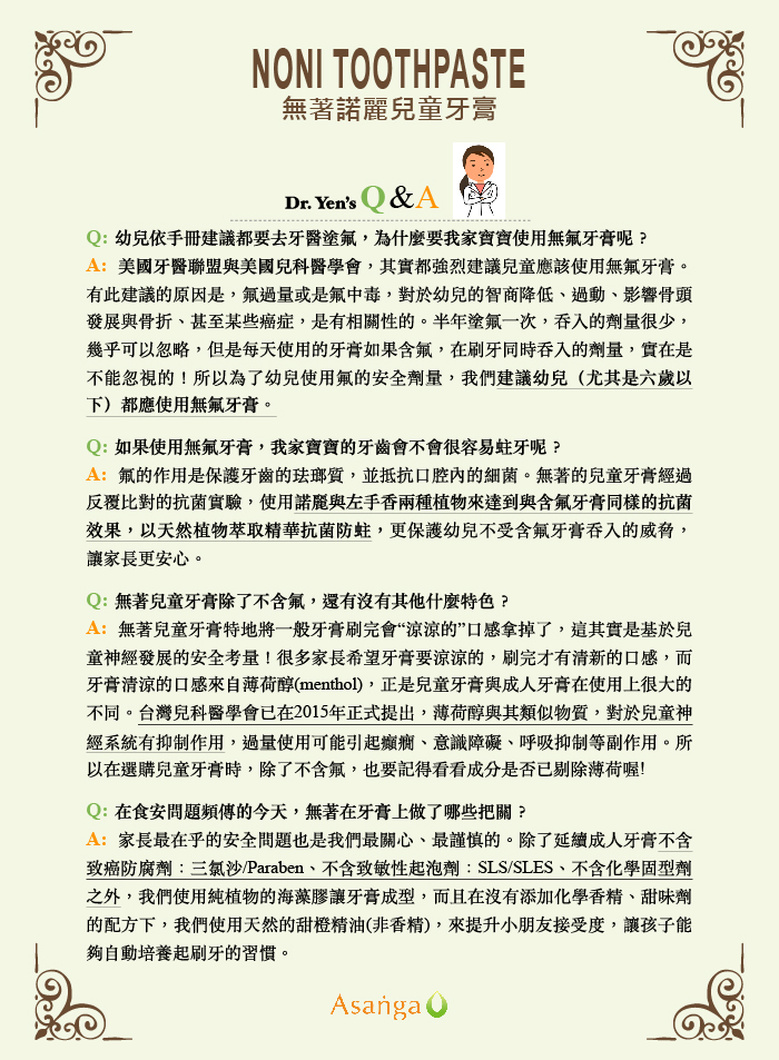 ※美國牙醫聯盟建議2歲以下幼兒不宜使用牙膏,2 - 6歲兒童建議使用不含氟牙膏。